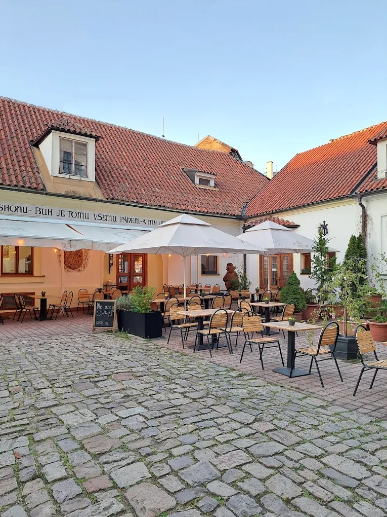 Restaurante Krčma, viejos clásicos checos, carne asada a la parrilla o aperitivos o ensaladas. Cerveza de tanque Pilsner Urquell y selección de vinos de Moravia.